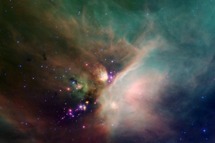 Newborn stars peek out from beneath their natal blanket of dust in this dynamic image of the Rho Ophiuchi dark cloud from NASA's Spitzer Space Telescope. Called "Rho Oph" by astronomers, it's one of the closest star-forming regions to our own solar system. In this false-color view, blue, green, and red represent light at wavelengths of 3.6-, 8-, and 24-microns, respectively. Spitzer science operations are conducted at the Spitzer Science Center at the California Institute of Technology in Pasadena, Calif. Image courtesy NASA/JPL-Caltech/Harvard-Smithsonian CfA