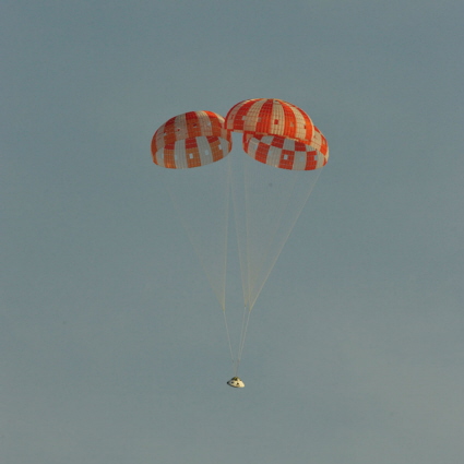 A model of NASA's Orion spacecraft descends following release from an Air Force C-17 cargo plane high above Arizona during a test on February 29. The drop examined the disturbance of the airflow behind the spacecraft. The event was the latest in a series of parachute drop tests conducted by NASA at the U.S. Army's Proving Grounds in Yuma, Arizona. Orion is being developed for the exploration of space beyond low Earth orbit. Photo courtesy of NASA