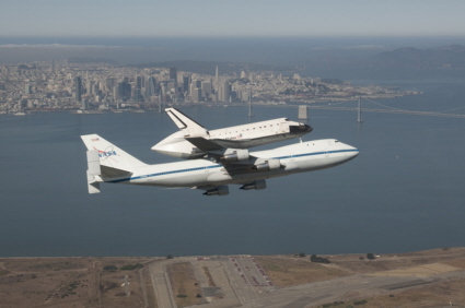 With downtown San Francisco and the San Francisco Bay Bridge in the background, space shuttle Endeavour atop its modified 747 carrier aircraft overflies the former Alameda Naval Air Station during the Tour of California on September 21. The tour was Endeavour's final flight before it becomes a museum display in Los Angeles. Image courtesy NASA/Carla Thomas